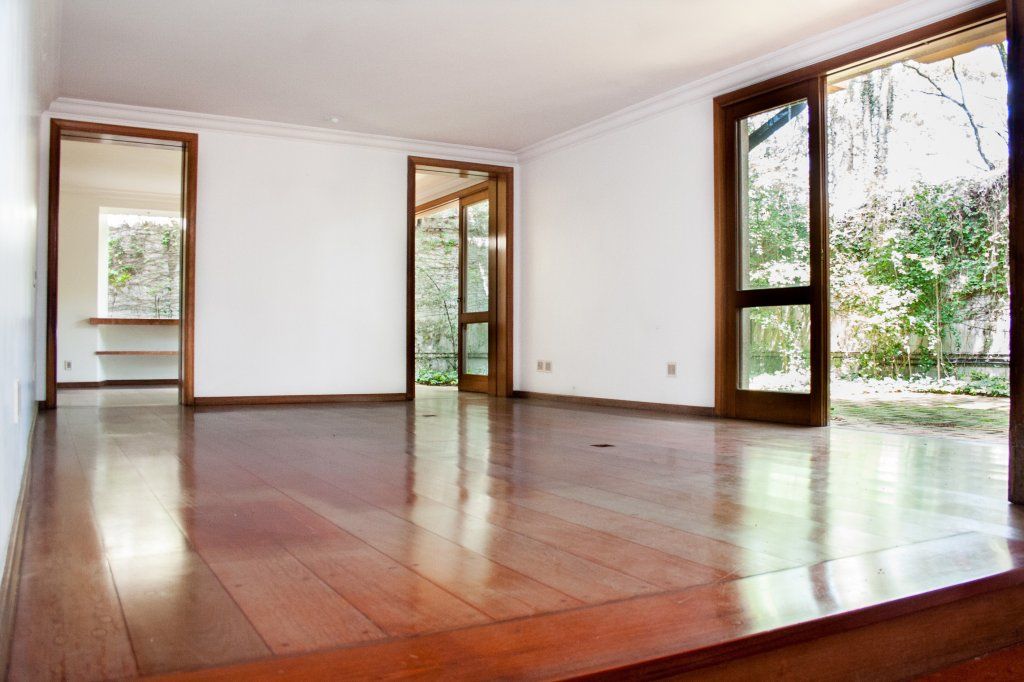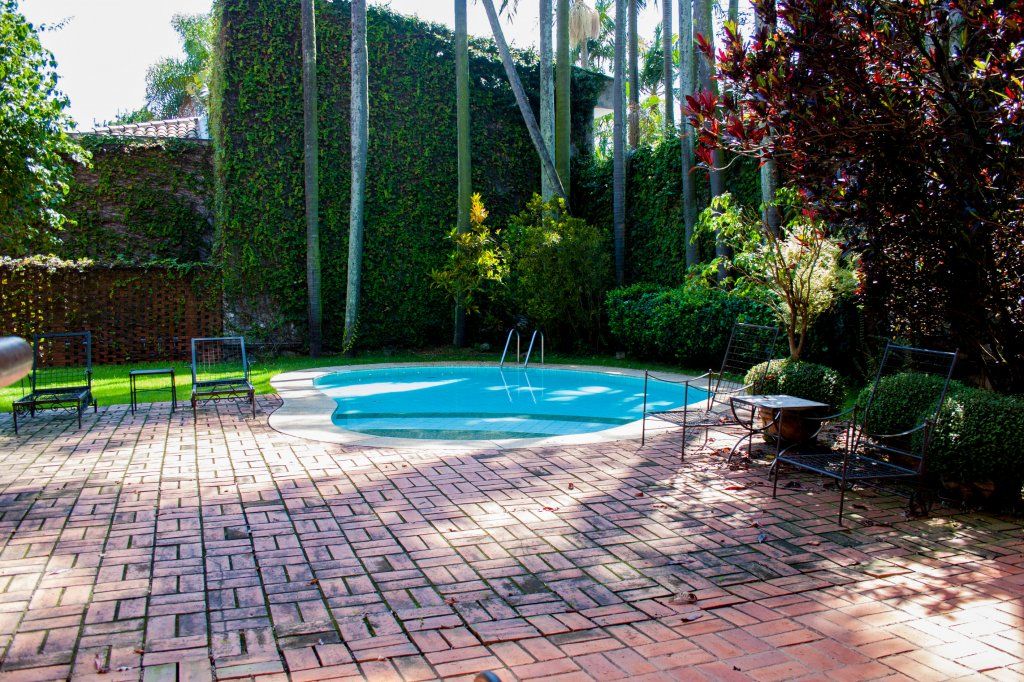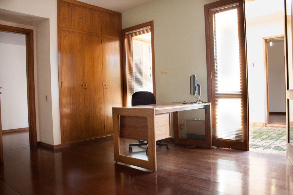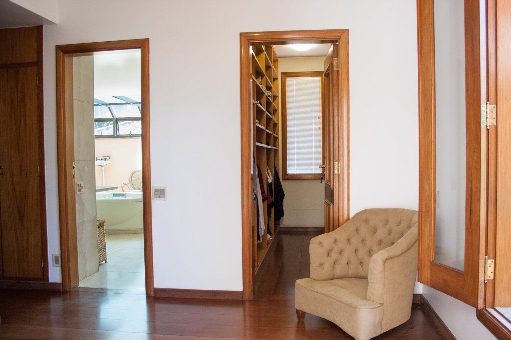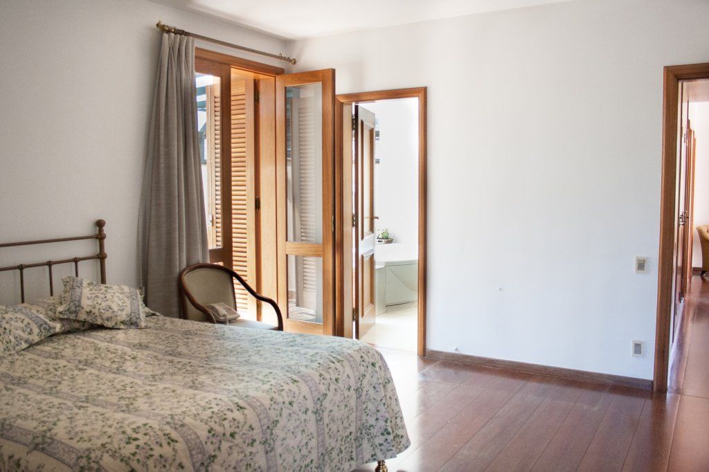 Construção sólida, excelente circulação interna e amplo jardim. 862 m² de terreno (com 27 m de frente) 816,69 m² de área construída PAVIMENTO TÉRREO Living, sala de jantar, sala TV, biblioteca, escritório, lavabo, copa, cozinha(Kitchens), prataria, 2 despensas, copa de empregados e lavanderia. oficina de hobby, churrasqueira, fogão a lenha e bar. Piscina, 2 vestiários completos. 2 depósitos suíte de zelador PAVIMENTO SUPERIOR: 4 suítes sendo 1 suíte máster com closet, escritório, sala de vestir, varanda - banheiro casal com varanda interna privativa. Sala de estudo, varanda interna. Área de serviço do andar de cima. 2 suítes de empregados com área service própria, no corpo da casa. Garagem coberta para 5 veículos mais duas descobertas, banheiro de motorista e faxineiros.