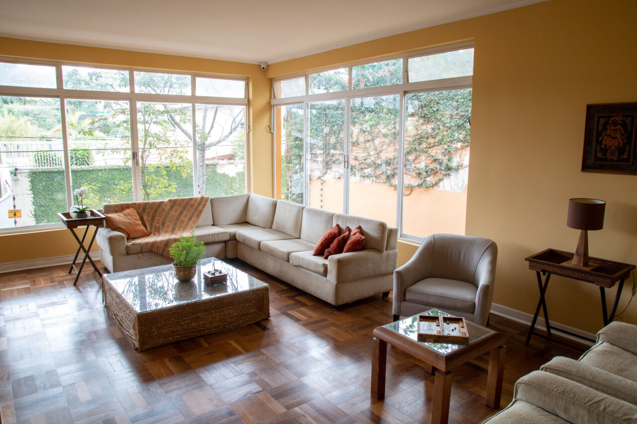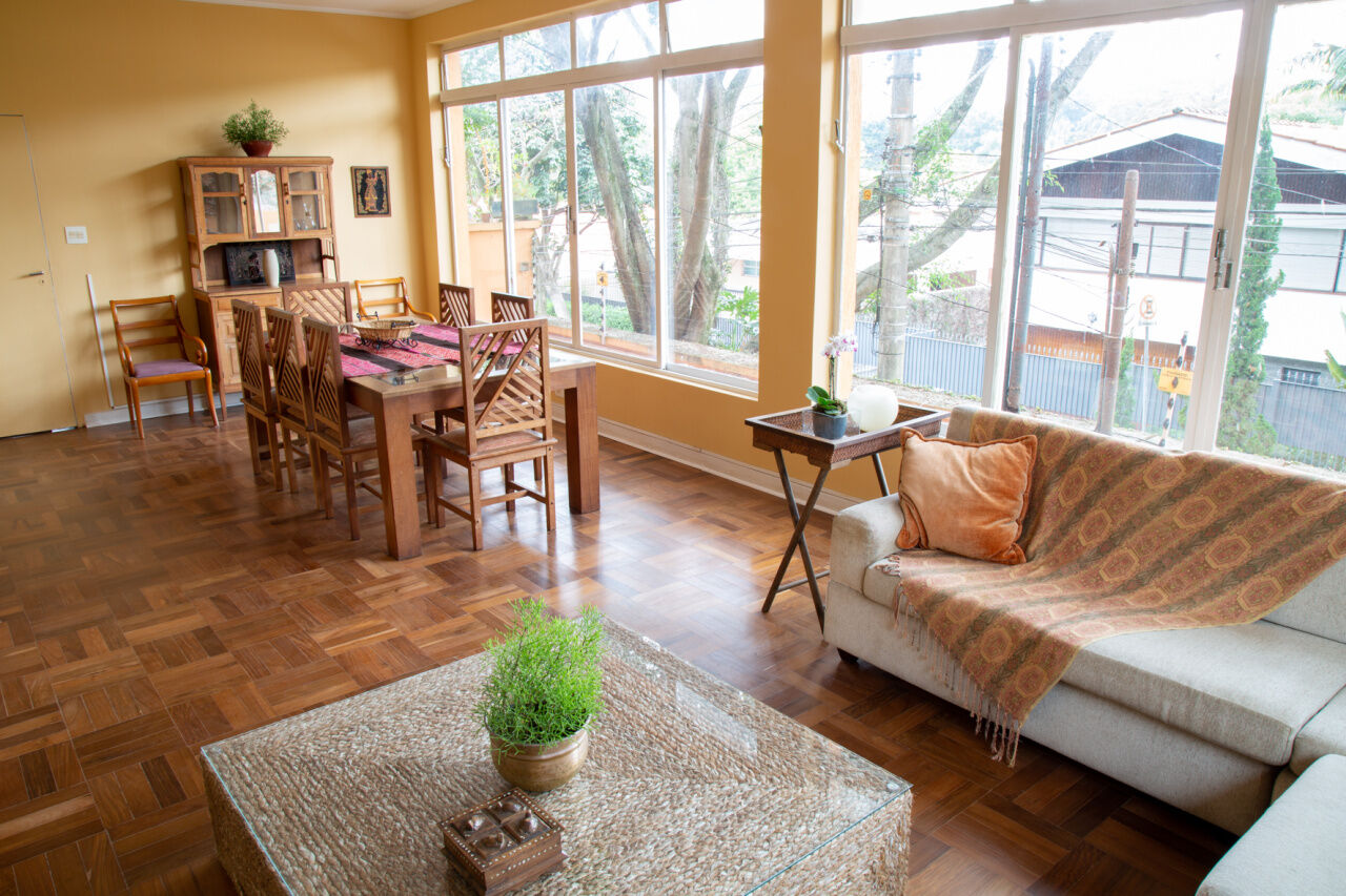 Casa com sala em L. Muita luminosidade por causa das janelas piso teto. Acabamentos: Piso Cerâmica, Piso Laminado, Piso Porcelanato. Cômodos: Área de Serviço, Cozinha Ampla, Lavabo, Sala de Jantar, Sala de Tv/Living. Lareira, Quintal churrasqueira, Cinema, Jardim.