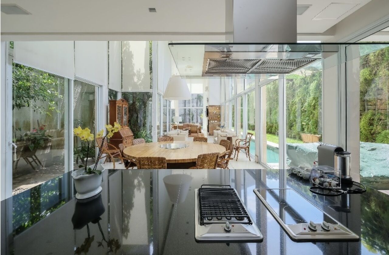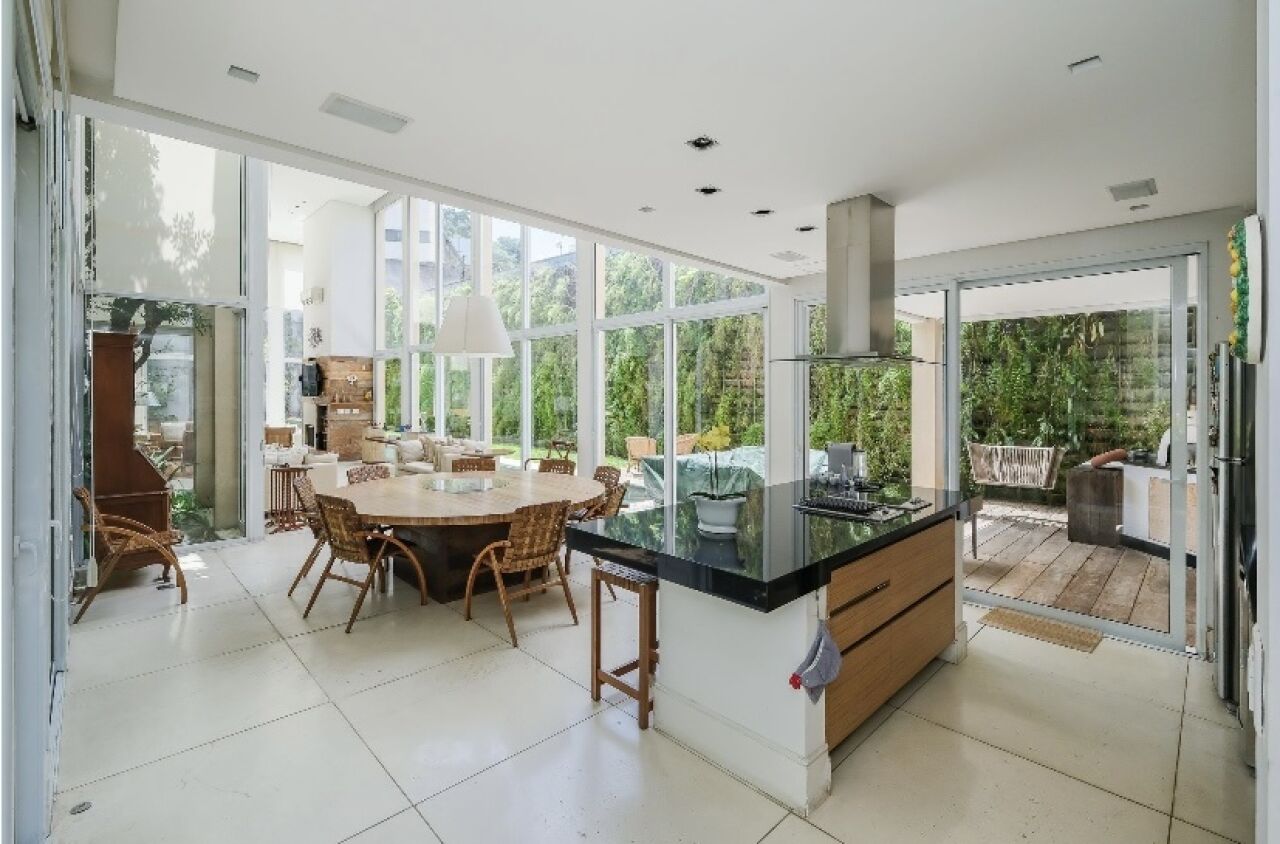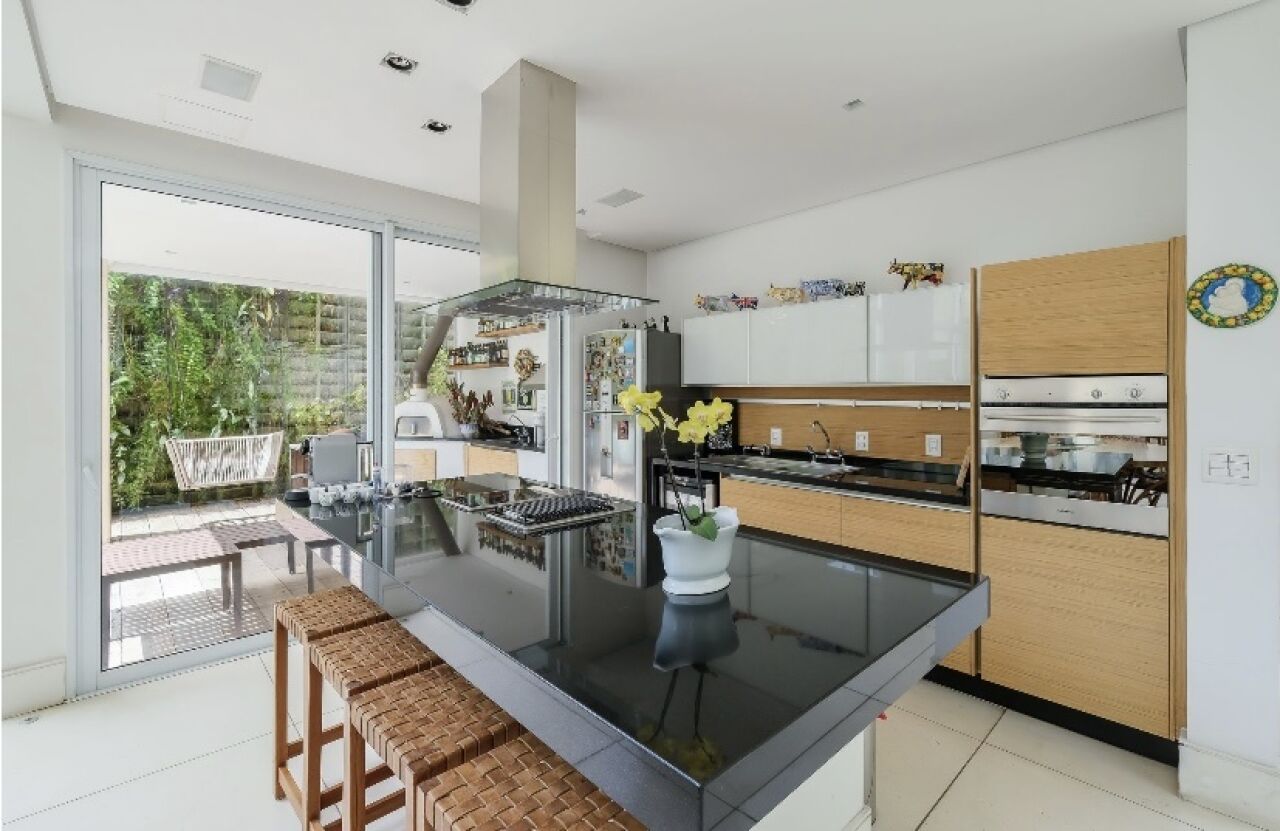 Piscina em L, com pedras Hijau, paisagismo GILBERTO ELKIS. Cozinha gourmet toda equipada com cooktop, grelha e coifa que integra com a area social 3 suites, sendo a principal com closet, escritorio e sala intima